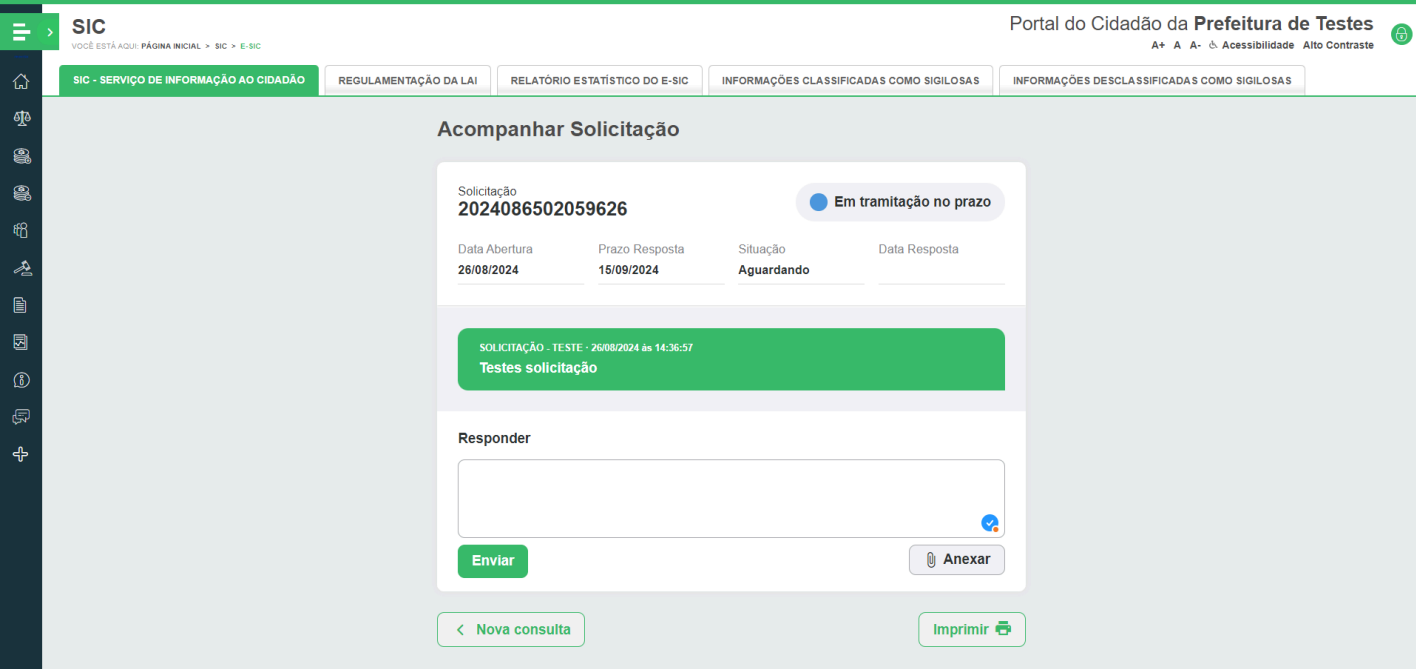 Na página de acompanhamento, é possível enviar uma nova mensagem relacionada à solicitação, anexar um novo documento ou responder à mensagem recebida.